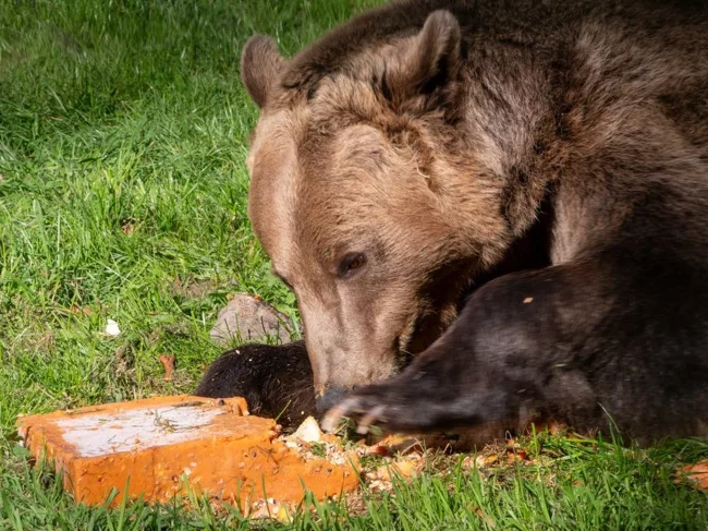 В октябре прошлого года трёхлетний бурый медведь Боки перенёс операцию по лечению гидроцефалии, которая вызывала у него судороги. Во время пятичасовой процедуры ему установили шунт для отвода лишней жидкости из мозга. Косолапый полностью восстановился и на днях отведал торт в честь своего дня рождения.