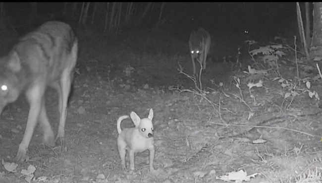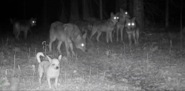 По интернету гуляет шокирующая новость: пропавшего чихуахуа обнаружили в стае диких волков! Причем не в качестве закуски, а как полноценного члена стаи! Подтверждением тому стали фотографии с фотоловушек в лесу, на которых микропёс уверенно держится среди огромных лесных хищников. Но как такое могло произойти?
