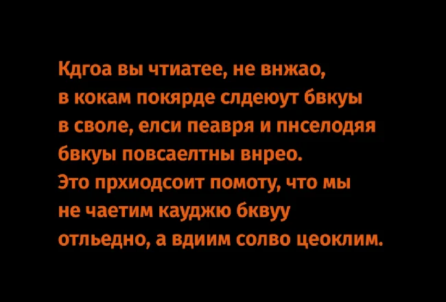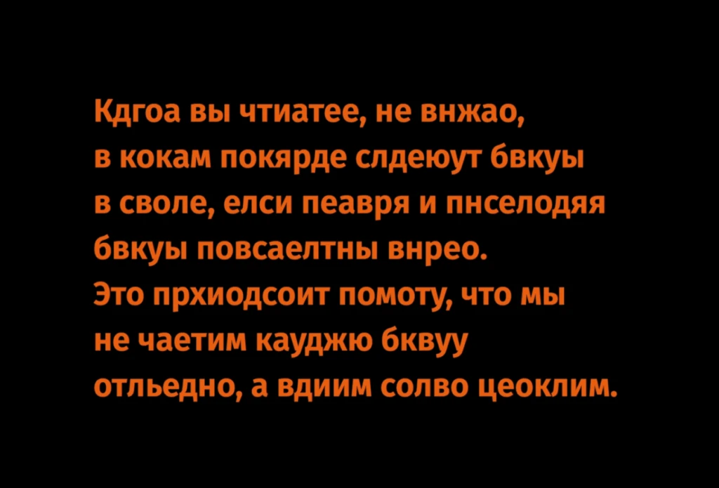 Когда ребенок только учится читать, он видит каждую букву отдельно и текст выше прочитать не сможет (точнее прочитать-то сможет, а понять- нет). Взрослые же не читают слово «целиком», мы лишь выискиваем знакомые слова в тексте, а дальше наш умный мозг сам их «додумывает». Вот такие мы умные!