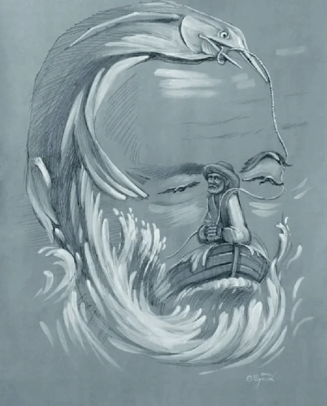 Потрясающий пример работ в стиле оптических иллюзий и сюрреализма. Только взгляните на Хемингуэя с его «Стариком и морем».