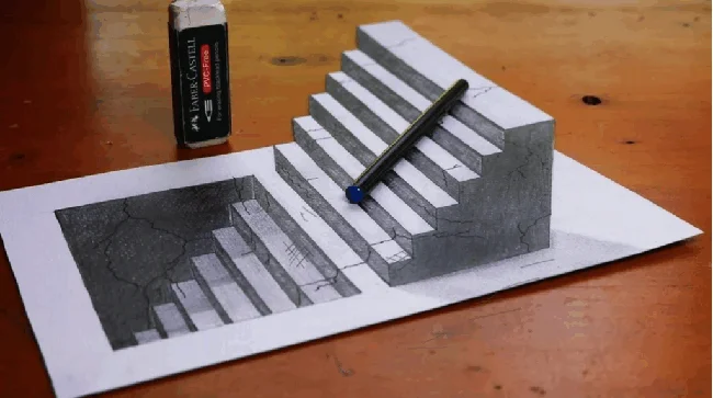 А как вам такая лестница? Кажется, что это объемная поделка из бумаги, но на самом деле это обычный плоский рисунок карандашом.