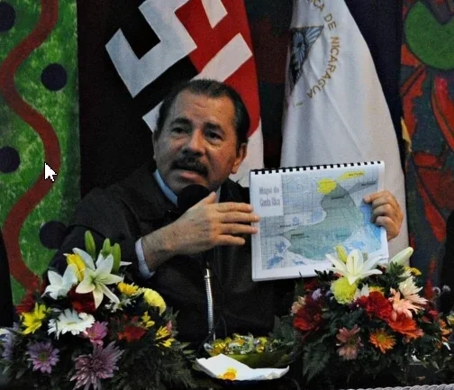 Президент Никарагуа Даниэль Ортега показывает карту спорных территорий во время выступления по телевидению о пограничном споре с Коста-Рикой.