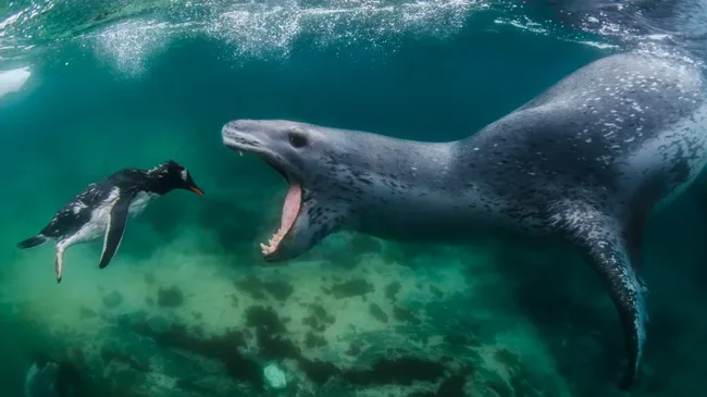2. Морской леопард, собирающийся съесть пингвина