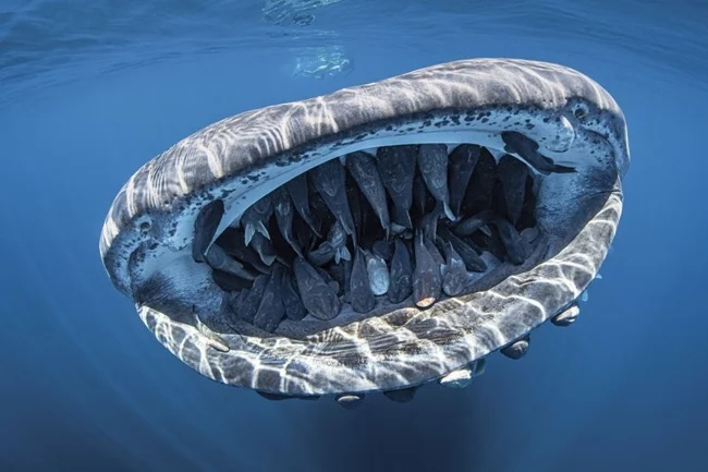 7. Китовая акула держит в пасти косяк рыб-ремор