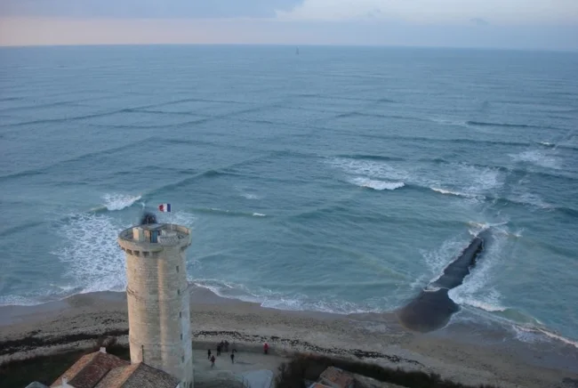 Редкое природное явление, при котором волны пересекаются под углом, образуя сетку на поверхности воды, визуально напоминающую шахматную доску.