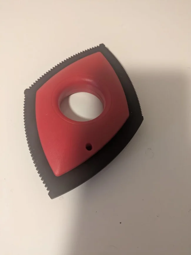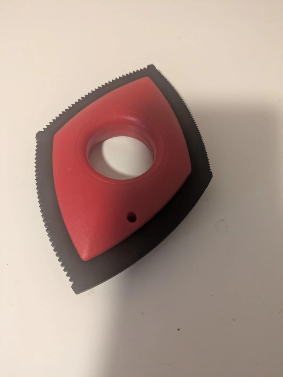2. Красная пластиковая вещица в виде ромба с отверстием и зазубринами по краям