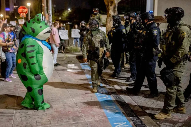 В США идут протесты против миграционной политики Трампа. Некоторые участники протестов начали облачаться в костюмы лягушек и называть себя «Портлендской бригадой лягушек».