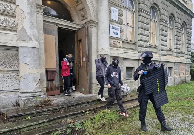 Учения "Odolné Česko 2025" были посвящены захвату объекта с активным стрелком. Сценарий: агрессор атакует класс с помощью огнестрельного оружия, полиция реагирует на вызов 158. Всё шло по плану в бывшем здании начальной школы на улице Seifertova — с актёрами-жертвами и "пострелушками".