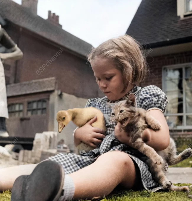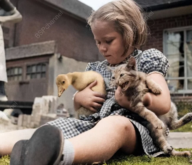 Гусь Дональд и котёнок Сэнди на руках у маленькой девочки, 1952 год.