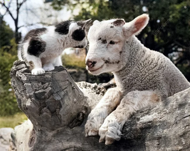 Котенок и ягненок в Чессингтонском зоопарке. Англия, 1948 год.