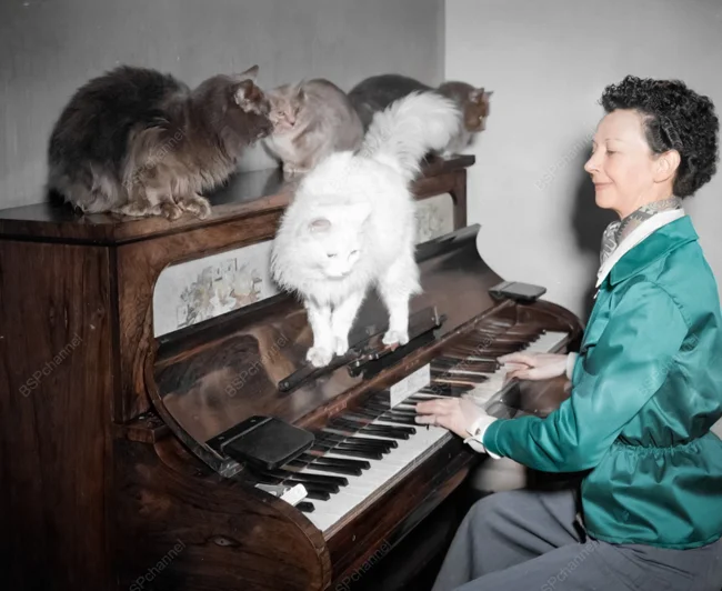 Женщина играет на пианино для кошек разных пород, 1954 год.