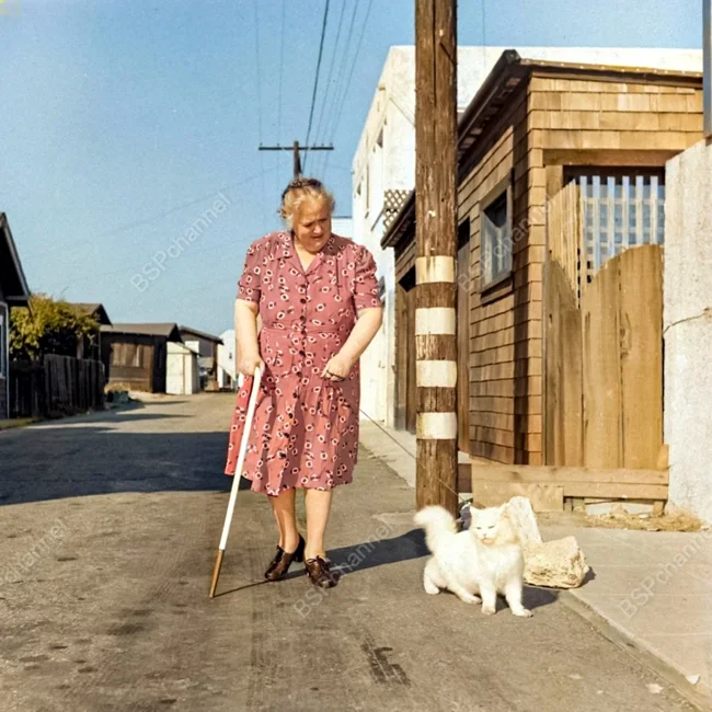 Кот-поводырь Бэби и его хозяйка Кэролин Свенсон на прогулке, 1947 год.