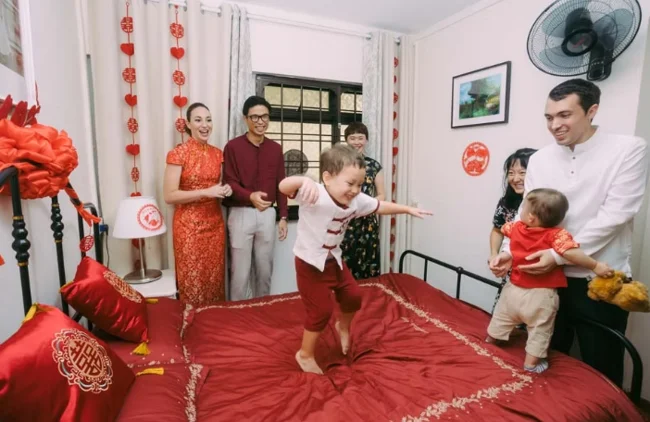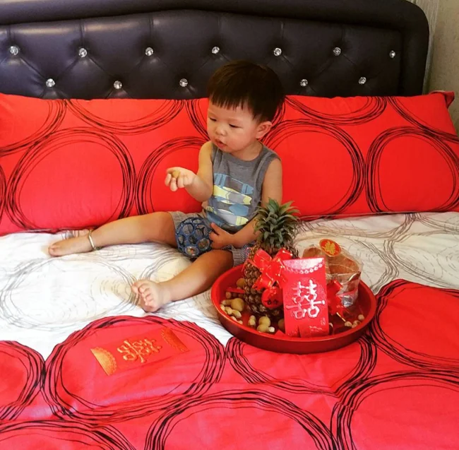 Традиции уже очень много веков и называется она гун чжуан или «переворачивание на кровати». Она зародилась на севере Китая, но с тех пор распространилась по всей стране, потому что цепляет за больное. Мальчик дошкольного возраста или из начальной школы должен кататься по красиво украшенной кровати, которая станет брачным ложем молодых. При этом должен напевать стишки, чтобы у пары были дети, а жизнь была благополучна. Его заранее учат фразам: «Эта кровать широкая, в следующем году она будет заполнена горами золота и серебра» или «Эта кровать длинная, и вскоре в этом доме поселится выдающийся ученый».