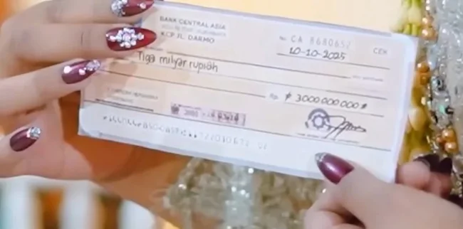 Жених публично вручил семье невесты солидный чек на 3 миллиарда индонезийских рупий в качестве свадебного выкупа. Свадьба прошла пышно, гостям дарили наличку. Короче все прошло дорого-богато.
