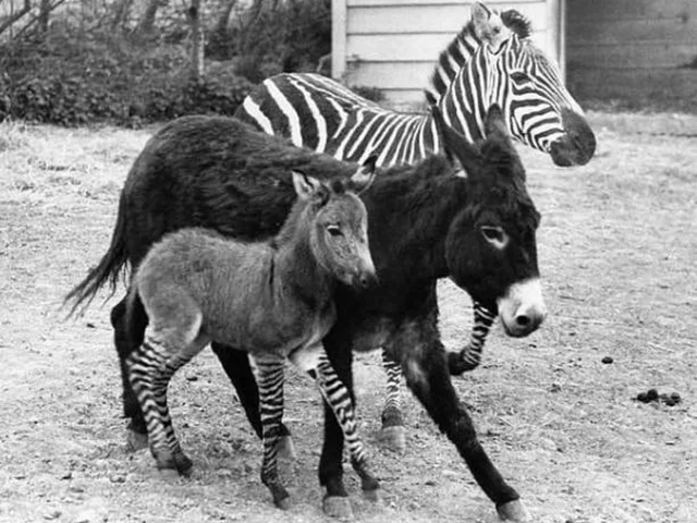 9. Очаровательный малыш с отцом-зеброй и матерью-ослицей в Колчестерском зоопарке в 1971 году