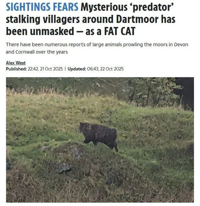 Легенды о загадочном звере, который гуляет по болотам и нападает на овец, давно ходили среди жителей британского Дартмура, но недавно тайну разгадали. Водитель случайно свернул не туда и вдруг увидел того самого хищника... Монстром оказался жирный кот!