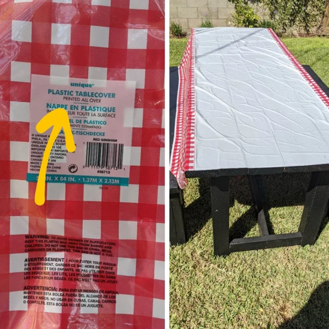Шикарная скатерть с оригинальной клеткой. Жаль, что узор только с краю, а самому столу не повезло.