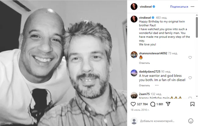 Для Вина Дизеля, как и для Доминика Торетто из "Форсажа", семья всегда на первом месте. А семья у него большая. У актёра трое детей от Паломы Хименес и трое братьев и сестёр — Саманта Винсент, Тим Винсент и брат-близнец Пол Винсент. Кстати, настоящее имя Вина Дизеля - Марк Синклер Винсент.