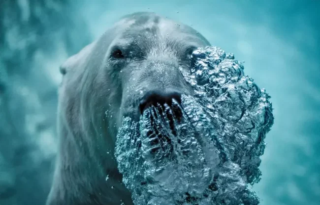 14. Снимок белого медведя, пускающего пузыри под водой