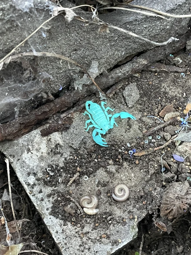 Почему скорпион ярко-синий? Потому что на него посветили ультрафиолетом. Почти все скорпионы становятся очень яркими под сильным ультрафиолетом. Предназанчение этого механизма пока неизвестно.