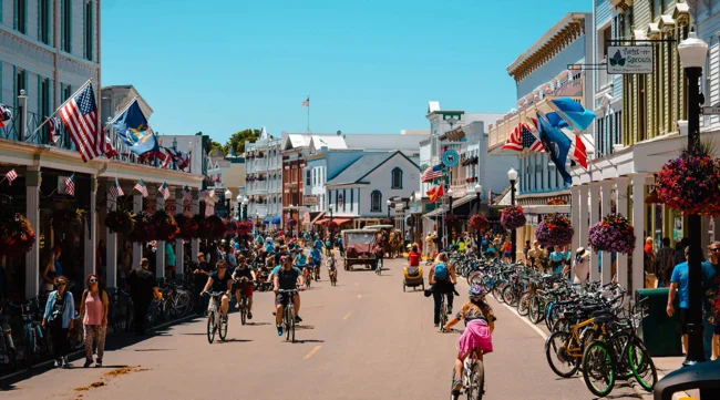 Перед вами одно из самых колоритных мест в США — небольшой остров Макино-Айленд, где уже более 127 лет запрещены автомобили и любой моторный транспорт. Там передвигаются только на лошадях и велосипедах.
