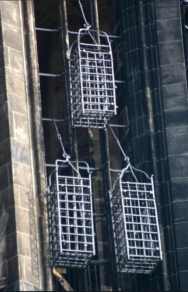 4. Железные клетки, в которых выставлялись тела трёх лидеров анабаптистов — Иоанна Лейденского, Бернта Книппердоллинга и Бернхарда Крехтинга