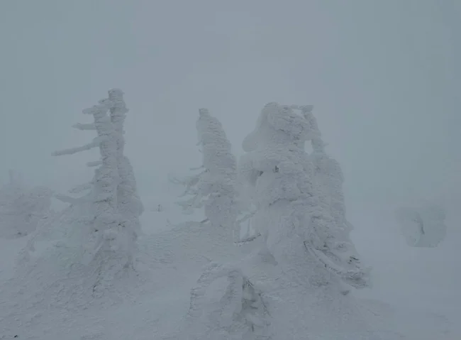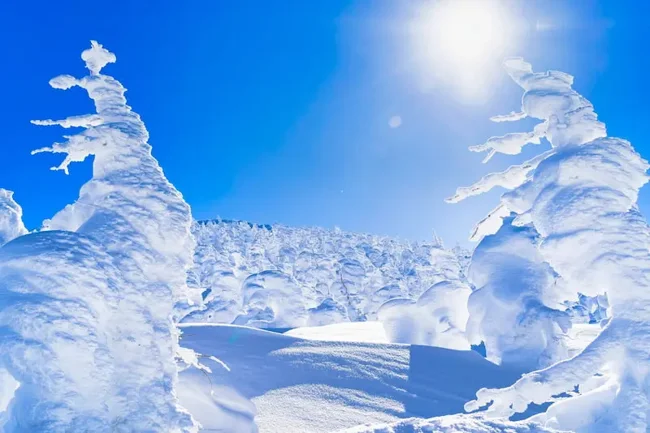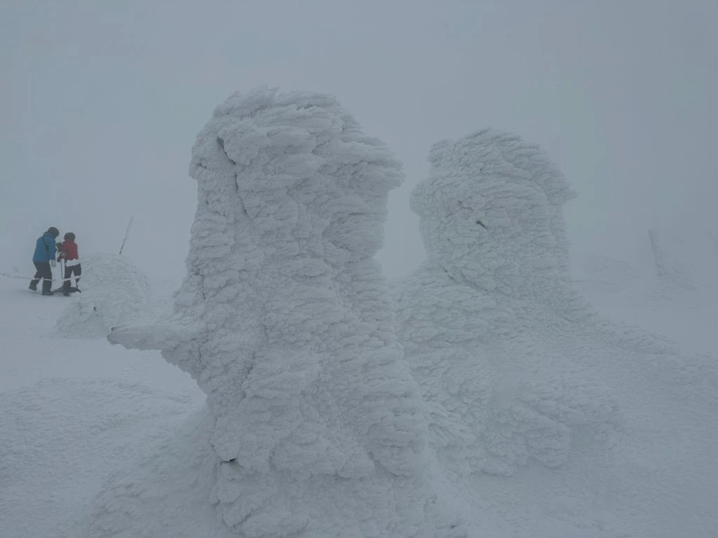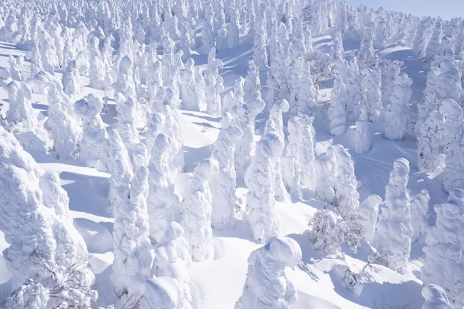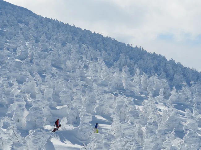 Мельчайшие капли воды, которые несёт мощный ветер, немедленно замерзают на соснах Дзао и их ветвях, формируя ледяные наплывы. Из-за постоянных шквалов эти ледяные гребни растут почти горизонтально, и на них оседает падающий снег, порождая исполинские причудливые белые фигуры. Японцы называют этих великанов снежными чудовищами, или джухё.