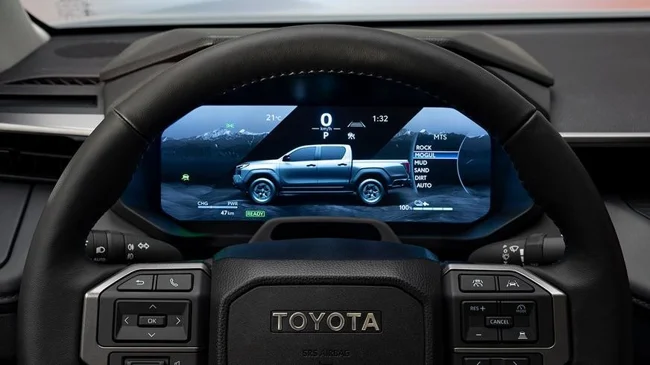 Архитектура интерьера Hilux сюрпризом не стала. В Сети ранее уже публиковали как патентные изображения его элементов, так и фотографии отдельных деталей. Автомобиль получил пару 12.3-дюймовых экранов на передней панели, но при этом сохранил полный набор физических переключателей вроде шайбы выбора режимов движения на центральной консоли, пульта управления климатической установкой и т. д.