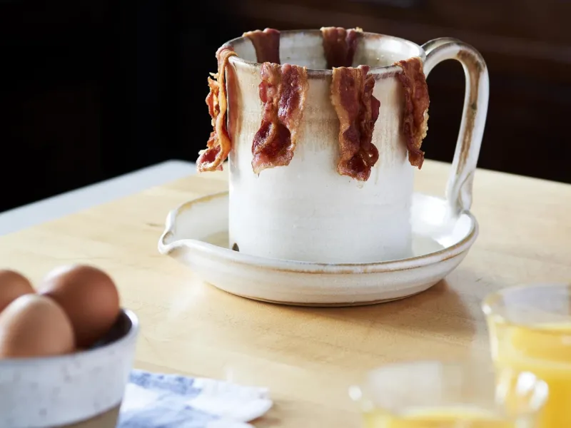 Ёмкость для жарки бекона в микроволновке. Ломтики развешиваются на краях чашки, а из отверстия стекает жир, который потом можно легко вылить из носика.