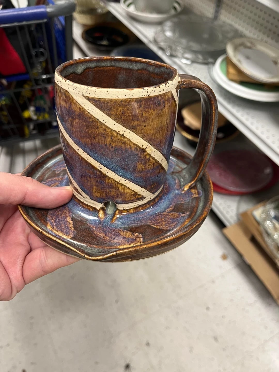 1. Керамическая кружка с блюдцем ручной работы, при этом у кружки есть отверстие в дне, а у блюдца носик для разливания