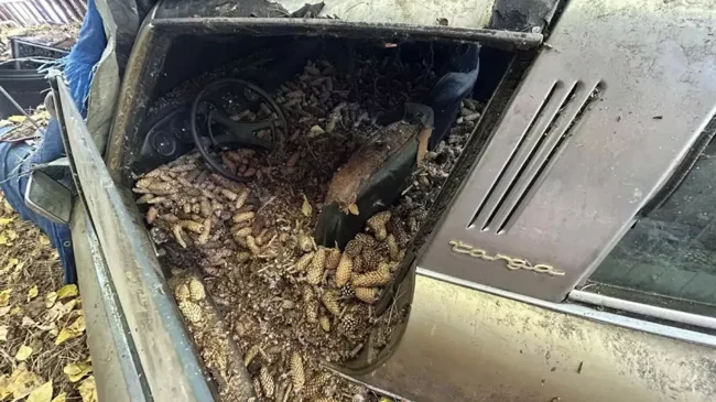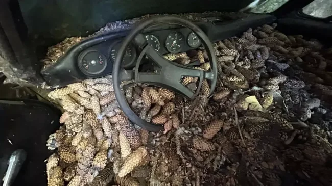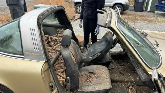 По какой причине владелец 31 год держал Porsche 911 фактически в условиях свалки, не уточняется. За это время тарга почти погрузилась в землю, а салон благодаря белкам оказался практически похоронен под слоем шишек.