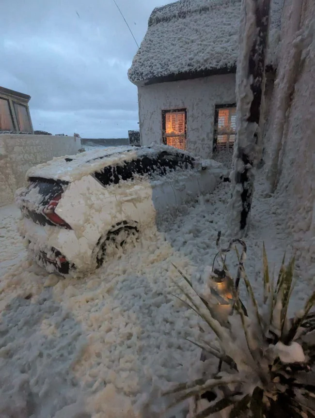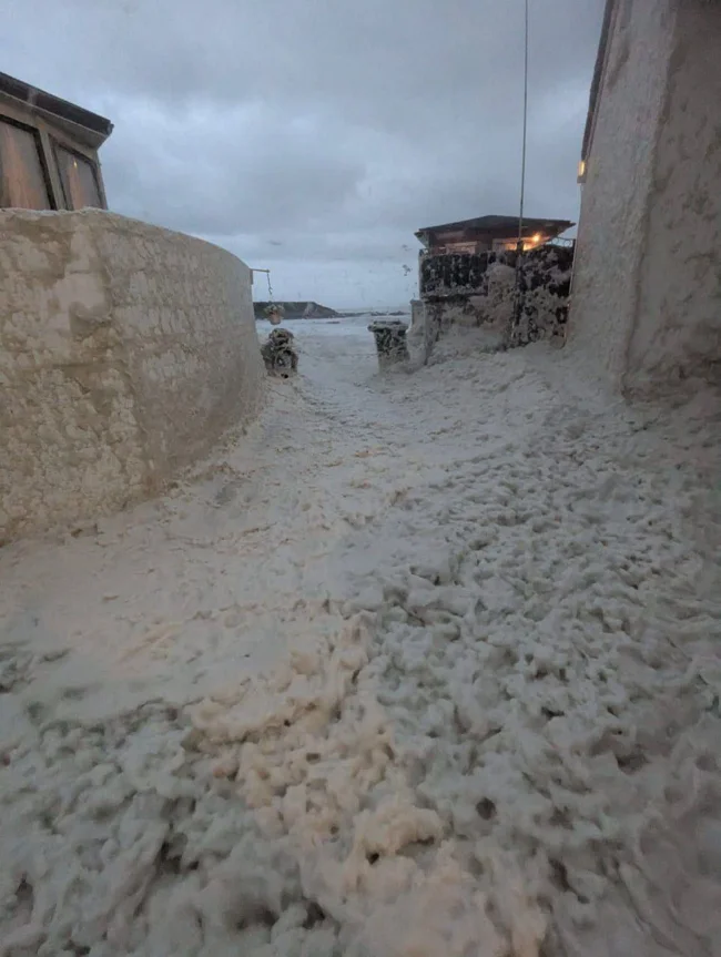 Местные СМИ сообщают, что на фото редкие последствием недавнего шторма. Так происходит при сильном волнении моря: штормовые волны взбалтывают воду, насыщенную органическими веществами. И если ветер силен, то пену может выбрасывать на берег в большом количестве. Что и произошло.