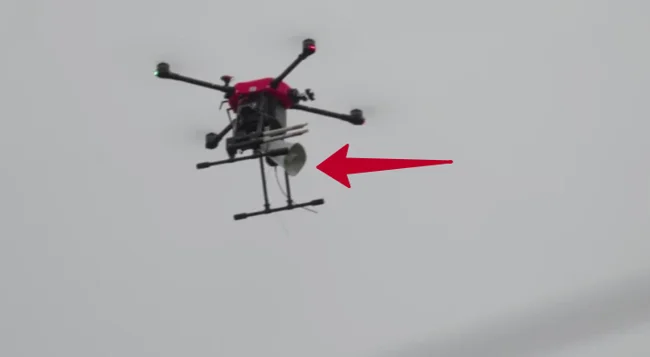 Ярко-красные дроны с двумя игрушечными глазами наверху и большим мегафоном «на пузе» летают вдоль окраин японских небольших городков. Дрон длиной в 0,9 метра разработан компанией Aero Japan. Она гордо назвала свое детище «охотничий дрон». Тут же вспомните недавнюю мою статью про охотничьи дроны со стрелами в Китае? А тут громкоговоритель и глазки.