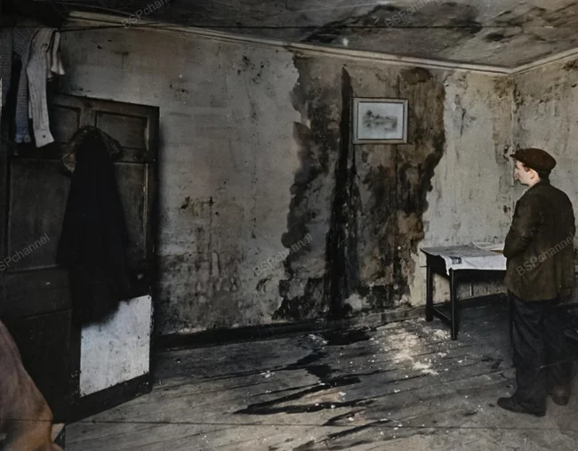 Мужчина, проживающий в трущобах Ливерпуля, осматривает большое влажное пятно на стене, 1935 год.