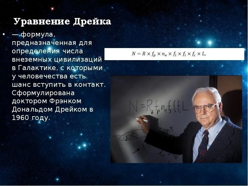 С середины прошлого века учёные пытаются обосновать с помощью математики вероятность существования внеземной жизни, желающей вступить в контакт с нами. Астроном Фрэнк Дрейк создал формулу, благодаря которой можно получить желаемый результат. Уравнение выглядит вот так: N = R* × fp × ne × fl × fi × fc × L. Тут по идее те, кто со школы не переносит формулы, должны закрыть статью, но обещаю, что больше никаких формул не будет, а с ней разберёмся очень просто.