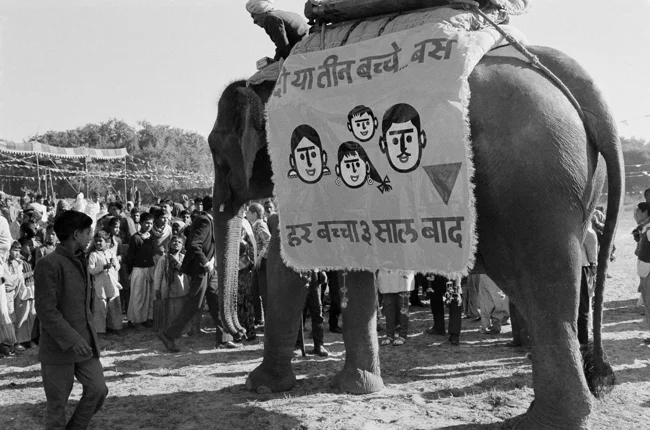 Слон, украшенный агитационным плакатом с призывом рожать максимум двое-трое детей, 1969 год