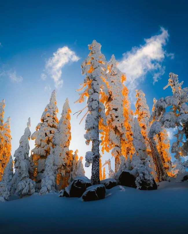 12. Солнце подсветило зимние деревья, сделав их похожими на ракеты перед стартом в космос