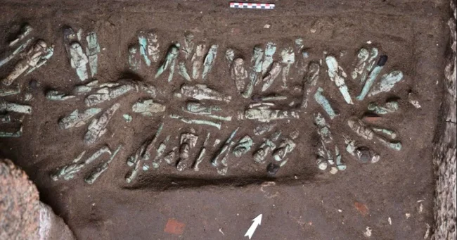 Изделия расставлены в форме звёзд и идеальными горизонтальными рядами, что свидетельствует о тщательно продуманном ритуале, который почти не менялся на протяжении трех тысяч лет.