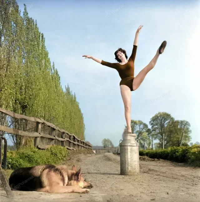 Балерина Джиллиан Броди танцует на ферме. Здесь она выступает на бидоне для молока, 1959 год.