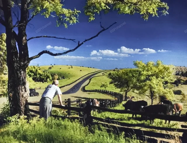 Мужчина опирается на забор рядом с полем, где пасутся коровы, чтобы полюбоваться видом на парковую зону Блу-Ридж среди гор в парке Доутон, Северная Каролина, около 1930 года.