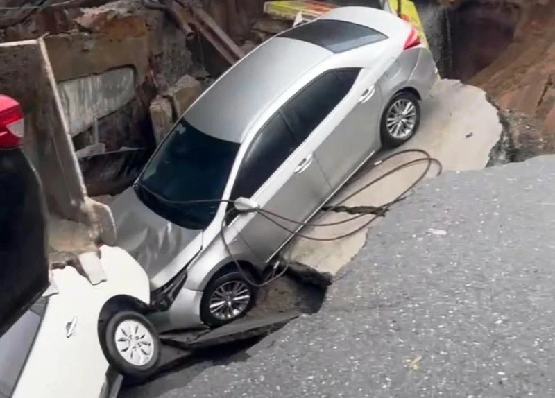 В центре Дананга внезапно образовался провал грунта, поглотивший два автомобиля (3 фото + 1 видео)