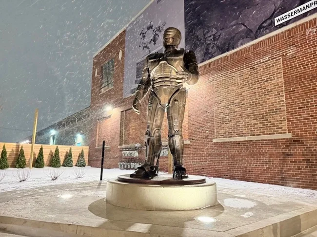 В районе Истерн‑Маркет в Детройте наконец нашлось постоянное место для бронзовой скульптуры Робокопа. Монумент высотой около 3,3 метра и весом в 1,6 тонны установили перед зданием студии видеопродакшна Free Age.