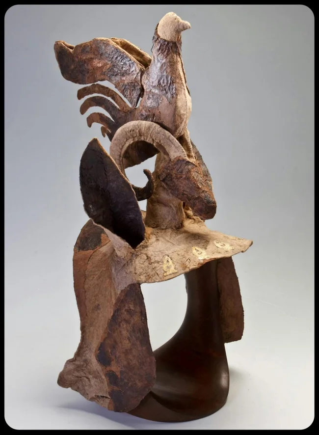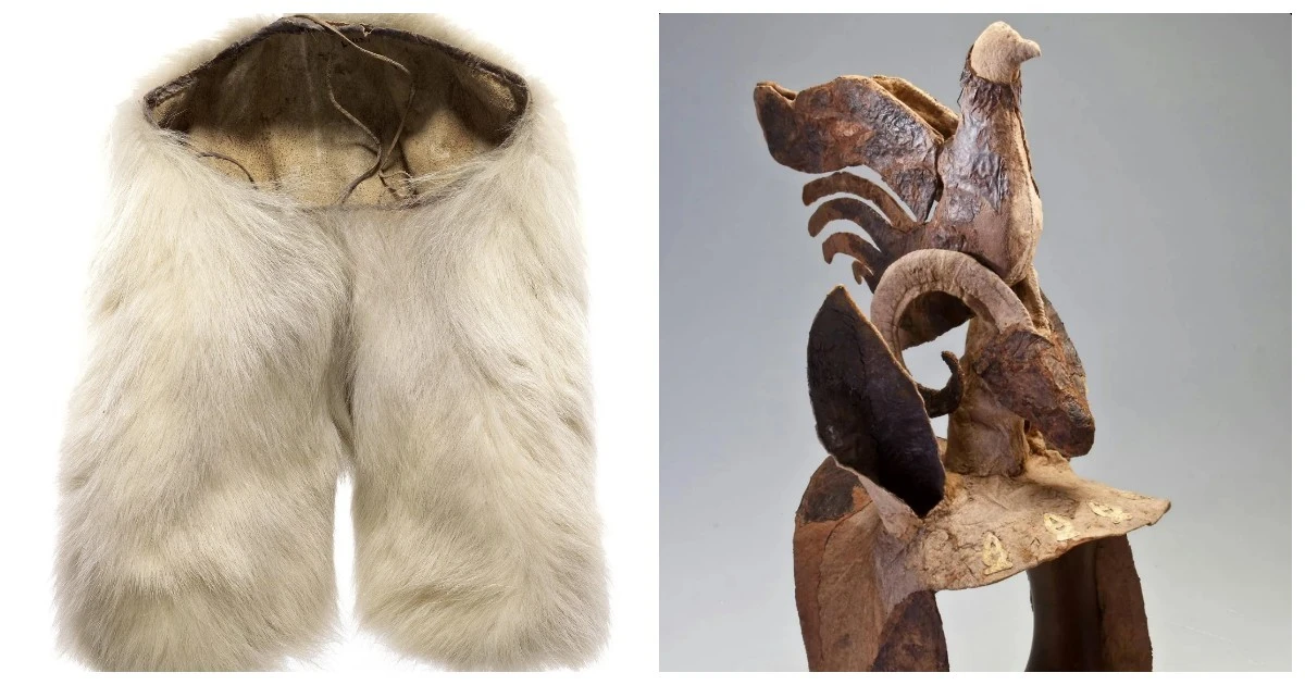 6. 2300-летний парадный убор для лошади, Сибирь, ок. 350–300 гг. до н.э. Эта сложная конструкция предназначалась для коня и украшена фигуркой петуха, восседающей на голове барана