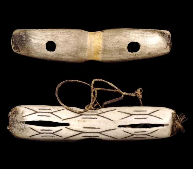Гениальное приспособление для защиты глаз от снежной слепоты в условиях яркого арктического солнца. Вырезанные из дерева или кости, они имеют узкие прорези, которые ограничивают попадание ультрафиолетовых лучей, отражённых от снега и льда, улучшая при этом контрастность зрения. Яркий пример функциональной и адаптивной технологии коренных народов Севера.