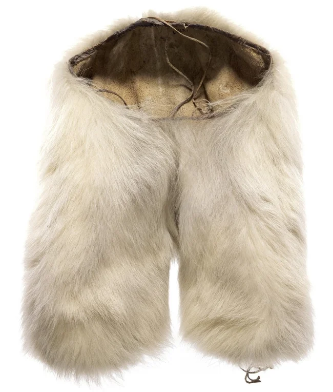 Подобная одежда, собранная европейцами в конце XIX века, была не просто тёплой — она обладала высочайшим статусом у инуитов. Мех самого могучего арктического хищника использовали для изготовления особой охотничьей экипировки, веря, что он передаёт человеку силу и выносливость зверя. Этот предмет — пример как практической адаптации, так и духовной связи с миром животных.