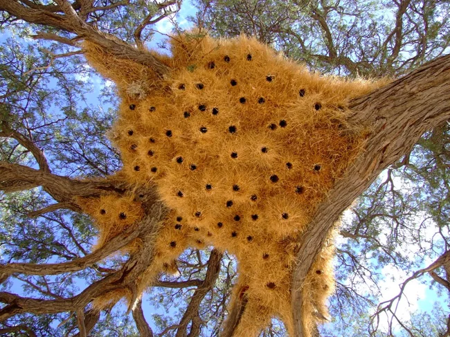Самый густонаселённый птичий дом строит обыкновенный общественный ткач (лат. Philetairus socius), обитающий в сухих саваннах Юго-Западной Африки. Эта птица создаёт громадное коллективное гнездо, которое может достигать восьми метров в длину и двух метров в высоту. Напоминая гигантский стог сена, свисающий с дерева или столба, оно вмещает до 300 отдельных гнёзд. В каждой "квартире" живут пара ткачей и их птенцы. Неудивительно, что эти колоссальные общежития иногда становятся настолько тяжёлыми, что дерево-опора не выдерживает и ломается под их весом.