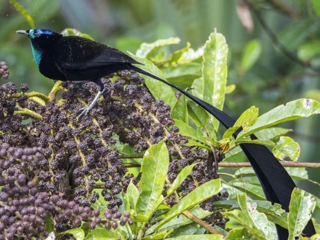 Самой тёмной птицей в мире является взрослый самец астрапии принцессы Стефании (Astrapia stephaniae) — длиннохвостой райской птицы из горных лесов центральной и восточной Папуа — Новой Гвинеи. Его длинные центральные перья хвоста обладают насыщенным, абсолютно глубоким чёрным цветом, который учёные называют суперчёрным или ультрачёрным из-за ничтожно малого отражения света. Этот эффект создаётся уникальной микроструктурой перьев: их бороздки имеют шиповидную форму и изогнуты вверх, а не гладкие и плоские. Ещё четыре вида райских птиц также обладают таким суперчёрным оперением, но с чуть более высоким коэффициентом отражения.