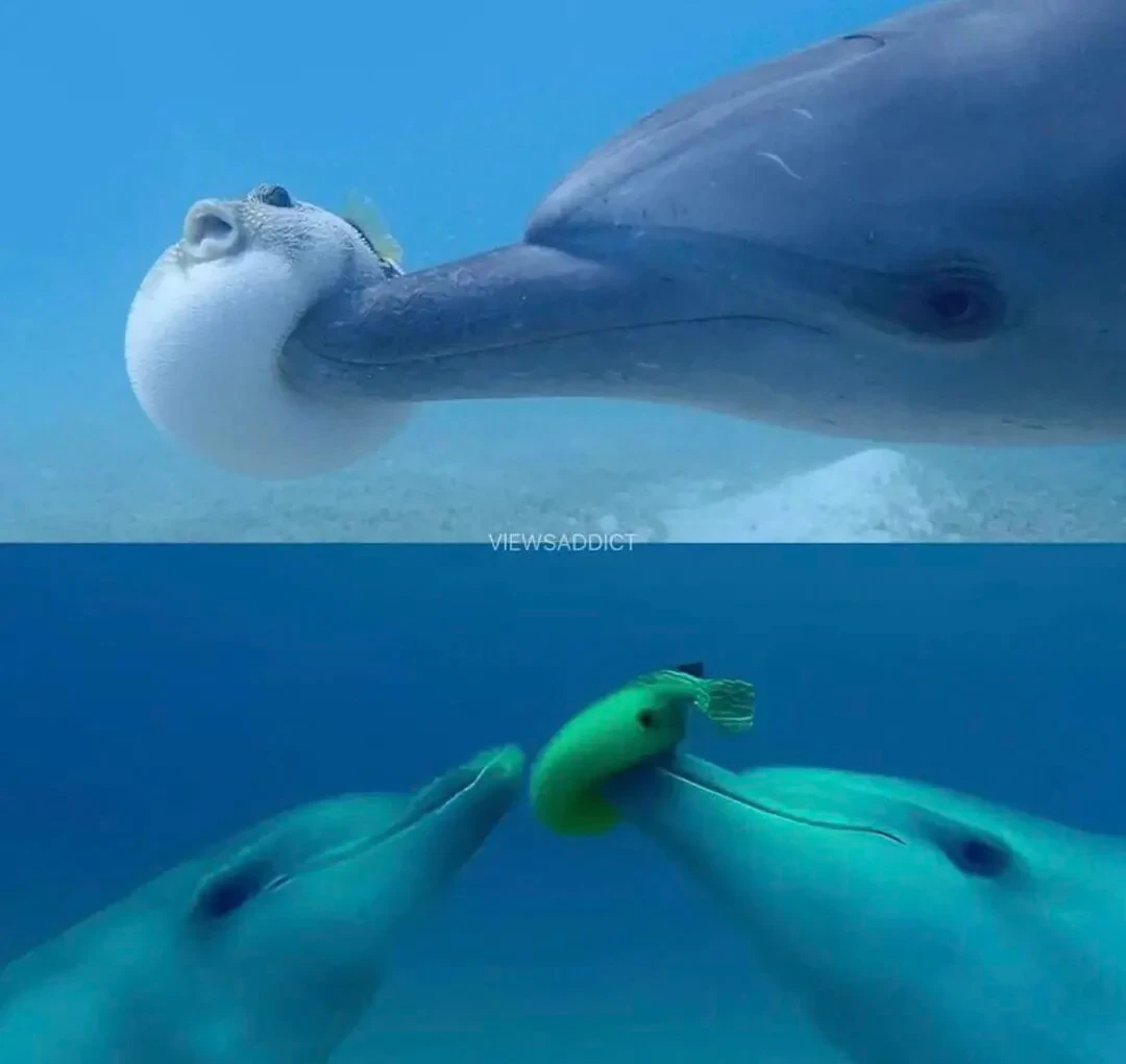 Ну и в качестве вишенки на торте: дельфинов подозревают в употреблении психоделических веществ. В 2013 году мир облетела новость о том, что афалины получают кайф от рыбы фугу. На видео стайка дельфинов играла с ней, словно с мячиком, неустанно при этом ту пожевывая. Испуганная рыба выделяла тетродотоксин — вещество, способное отравить взрослого человека — и после этого дельфины начинали вести себя «странно»: застывали в трансе, таращась на поверхность воды над ними.