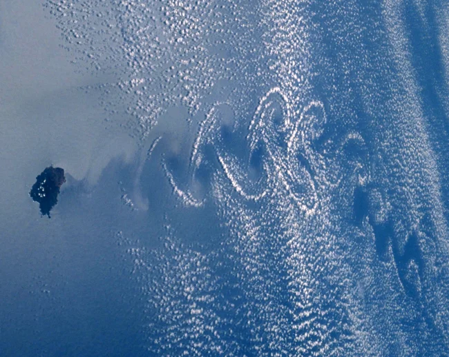 Появление облаков на ветренной стороне острова Сокорро, Мексика - 2/12/2000 (Image courtesy of the Image Science & Analysis Laboratory, NASA Johnson Space Center)
