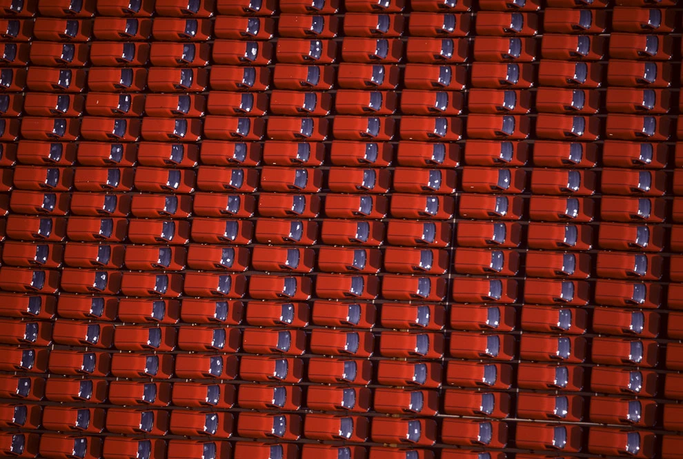 Красные внедорожники, любимые автомобили всех модных женщин, в ожидании отгрузки припаркованные на бывшем аэродроме в Аппер Хейфорд, в графстве Оксфордшир, Великобритания. Google Map (© Jason Hawkes)